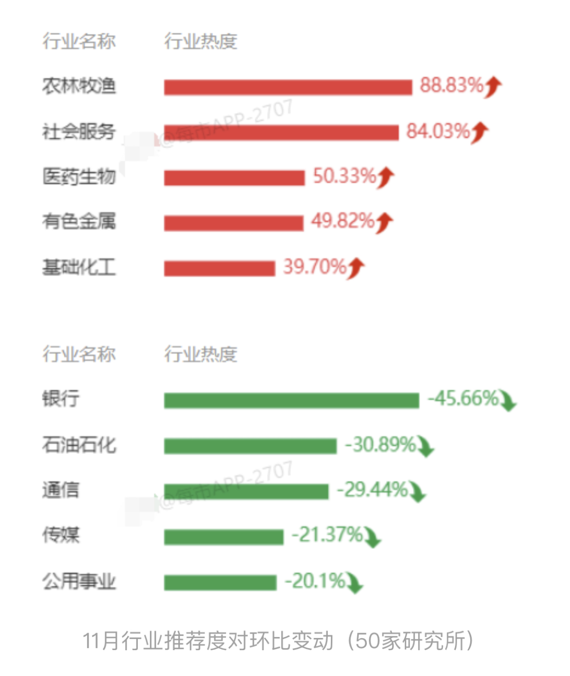 从行业热度的轮动来看,11月农林牧渔行业热度暴涨88.83%,社会服务也紧随其后,以84.03%的火热度位列第二;医药生物、有色金属、基础化工本月热度也皆有超30%的上涨。另一方面,过去表现一直不错的银行业此番也有45.66%的下跌,前几个月的热门传媒、通讯等本月皆有不同程度的热度下滑。