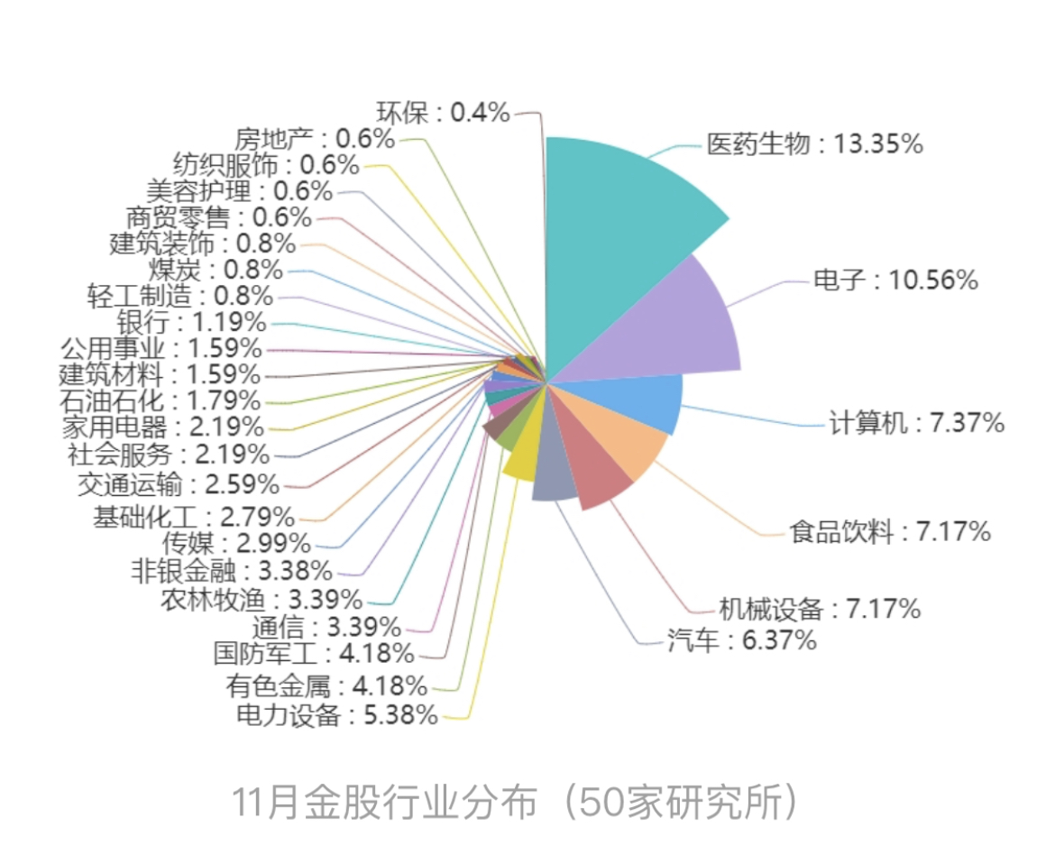 从行业角度来看,医药行业在11月王者归来,推荐度占比达到13.35%。