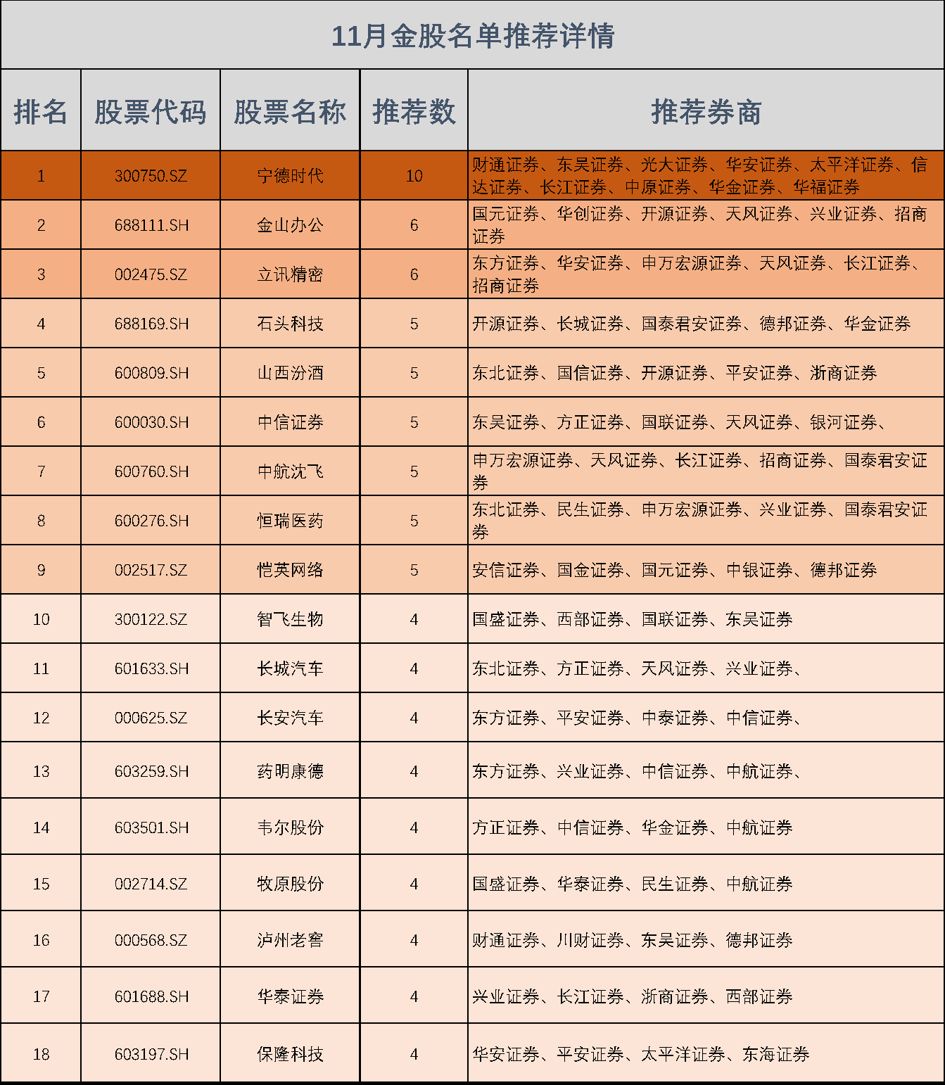 具体来看,在各大券商研究所公布的金股名单中,宁德时代(300750.SZ)继10月与最热门失之交臂后重新站上榜首,成为11月最热门金股并同时获得10家机构的推荐;金山办公(688111.SH)、立讯精密(002475.SZ)则分别被6家机构推荐并列第二名;被5家券商推荐的个股有中信证券(600030.SH)、中航沈飞(600760.SH)、石头科技(688169.SH)、山西汾酒(600809.SH)、恺英网络(002517.SZ)和恒瑞医药(600276.SH)。