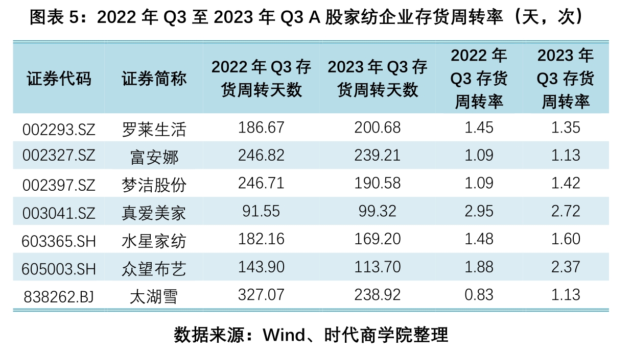 罗莱生活、真爱美家的存货周转率与行业走势相悖,从2022年前三季度的1.45次/年、2.95次/年分别下降至2023年前三季度的1.35次、2.72次。
