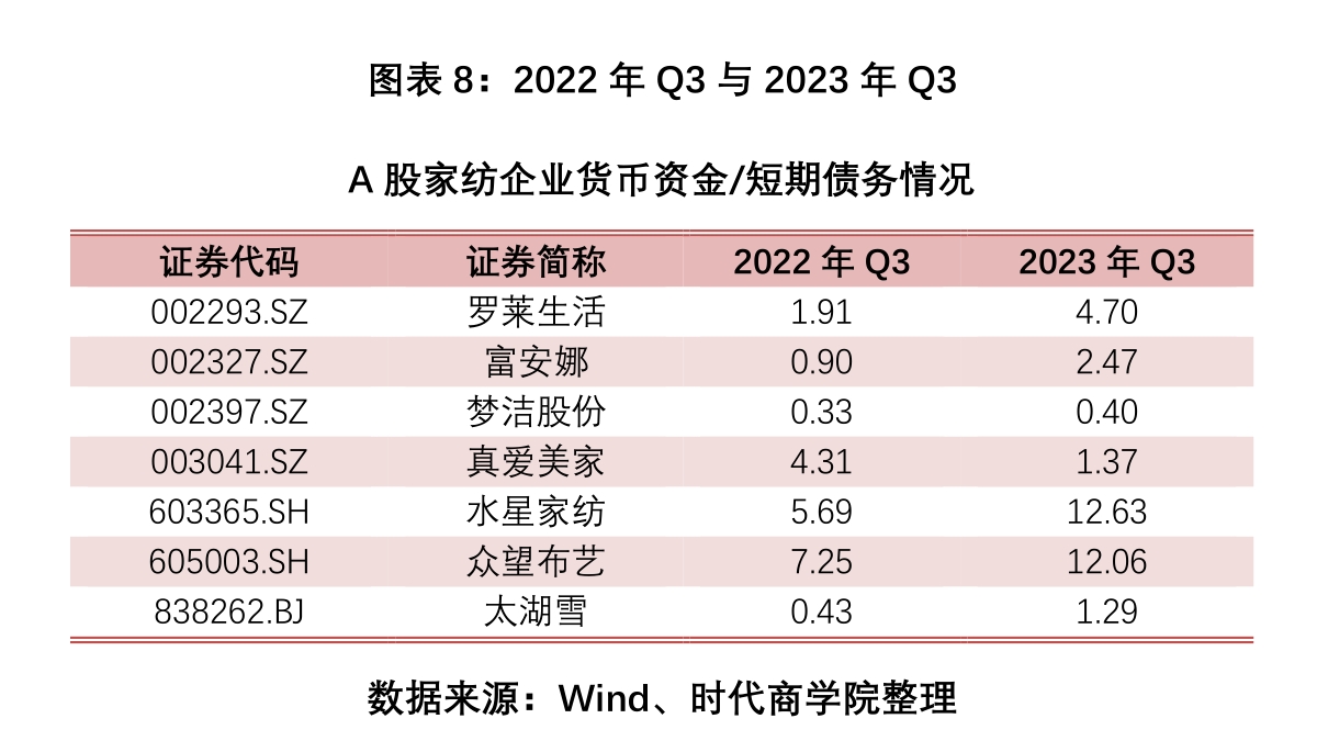 货币资金与短期债务比率是衡量短期债务的偿还能力指标。Wind显示,2023年前三季度,7家家纺企业的货币资金/短期债务比率均值为6.9,同比上升2.4个百分点。