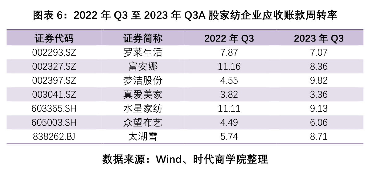 除存货周转率外,7家家纺企业的应收账款周转情况亦有好转趋势。2022年前三季度、2023年前三季度,7家家纺企业的应收账款周转率均值分别为6.95次、7.5次。