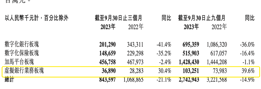 金融壹账通最新三季度财报显示,截至9月30日,虚拟银行业收入今年前三个季度收入为1.03亿元,较去年同期增加了39.6%;而金融壹账通的数字化银行板块、数字化保险板块、加马平台板块业务,今年前三个季度季度业务收入同比皆呈下滑状态。