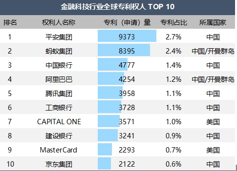 2018年以来,金融科技行业的科技创新领军企业包括中国平安、蚂蚁集团、中国银行、阿里巴巴、腾讯集团、工商银行、CAPITAL ONE、建设银行、万事达卡以及京东集团,依次位列专利权人榜单前十位。中国权利人位列8席,中国平安以9373件的专利申请量位列首位,领先第二位蚂蚁集团(8395件)约1000件,领先优势明显,彰显了中国平安在金融科技行业的创新活力和技术实力。