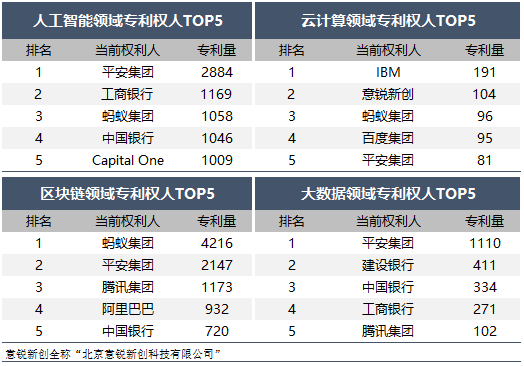从重点支撑技术专利权人分布情况来看,中国平安与蚂蚁集团领跑金融科技技术创新赛道,竞相展现强大技术实力,在多项重点技术的专利申请量排名中均位列TOP 3。其中,中国平安在人工智能、大数据领技术领域位列第一,在区块链和云计算技术领域亦位列前五,成为唯一一个四项重点技术均跻身前五的专利权人。