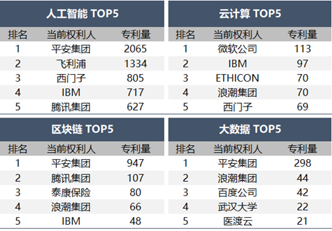 医疗健康行业的创新和发展离不开支撑技术的支持和推动。从各重点支撑技术专利权人分布情况来看,中国平安在医疗健康行业专利申请布局实力尤为突出,其在人工智能、区块链和大数据技术方向上的专利申请数量均位列第一。这些技术为医疗健康行业创新和发展提供重要支持,为中国平安在医疗健康行业中的竞争提供了坚实基础。
