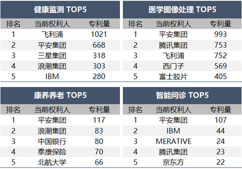 伴随数字技术在医疗健康行业的广泛应用,医学图像处理、健康监测、智能问诊、康养养老已成为医疗健康行业的重要应用场景,这些应用场景的进步共同推动了医疗健康产业的发展,能够进一步提高医疗健康服务效率,改善人们对医疗健康服务的体验。从各应用场景专利权人分布情况来看,中国平安在医疗健康行业各应用场景专利布局实力均非常突出,其在医学图像处理、康养养老和智能问诊领域的专利申请数量均位列第一,在健康监测领域位列第二。这表明中国平安在医疗健康各应用场景均拥有优异的团队和卓越的研发实力。