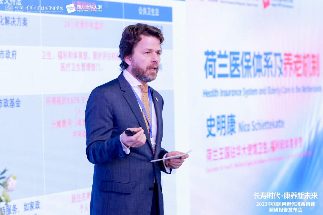 发布会现场主旨演讲环节,大会特别邀请到荷兰王国驻华大使馆卫生、福利和体育参赞史明康发表了题为“长寿时代:未来退休面面观”的主旨演讲,为与会嘉宾揭开了荷兰医疗保险制度及养老机制的神秘面纱。史明康介绍,荷兰的医疗保障体系已经有150多年的历史,因为荷兰以提供高质量、可负担和可获得的医疗保障而闻名。在荷兰,GDP的4%用于长期护理包括老年人护理,这一比例高于其他发达国家。除了改善老年人的生活质量和环境外,技术和创新是避免荷兰老年人护理部门支出增加和人员成本增加的重要因素。