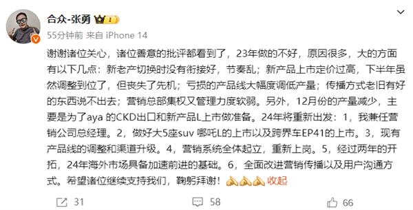 张勇随后表示,营销上很快会有大的改变。他还直言“有好东西说不出去,要深刻检讨,营销系统对不起研发团队的努力。”此番公开发文刀刃向内,在车企掌门中实属罕见。