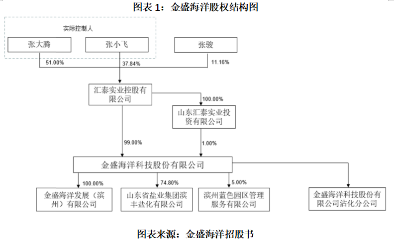而汇泰实业由张大腾、张小飞两兄弟控制,两人合计持股88.84%,两兄弟的堂兄张骏持有剩余11.16%的股权。可见,金盛海洋由张氏家族100%持股,“家族企业”色彩浓厚。