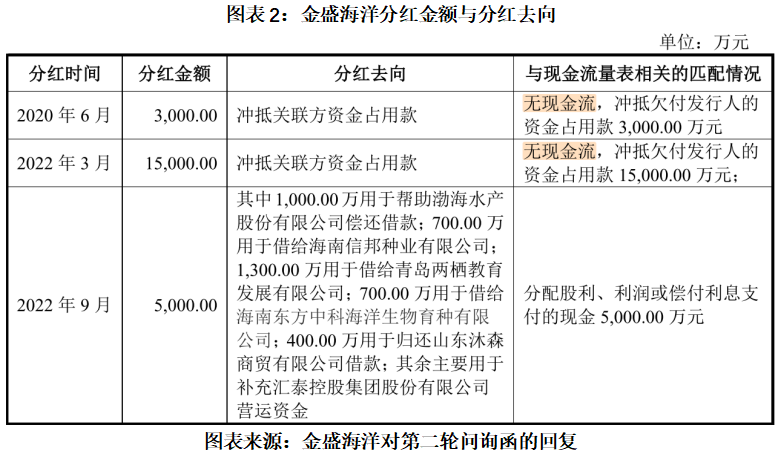 金盛海洋对第二轮问询函的回复显示,2020年6月、2022年3月,金盛海洋合计现金分红1.8亿元,但这些分红未形成实际的现金流动,而是全额冲减汇泰集团、汇泰实业欠付金盛海洋的资金占用款。