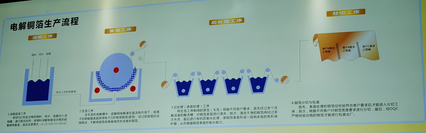但生产这条“跑道”却复杂得多。在生产线上,生箔机上的阴极辊,浸在流动着硫酸铜溶液阳极槽里不停地转动,溶液中的铜离子吸附到阴极辊表面形成铜箔,再由收卷系统精准而轻柔地将其从阴极辊上剥离出来,闪耀着金色光芒的铜箔就这样源源不断地生产出来。