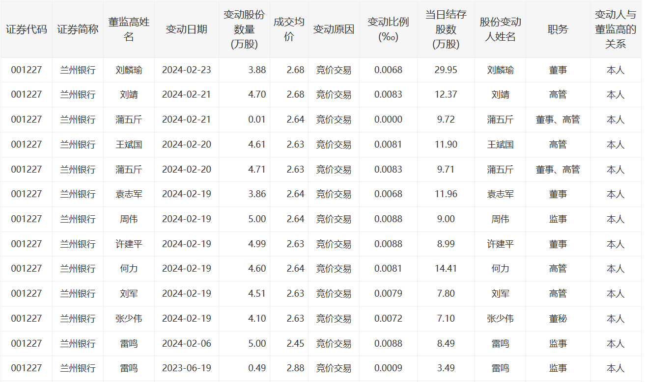深交所信息披露显示,2024年2月,包括兰州银行董事长许建平、行长蒲五斤在内,共有11位董监高对该行股权进行12次增持。