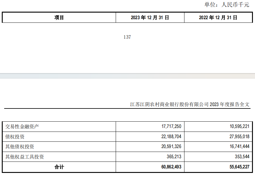 截至2023年末,江阴银行共持有金融投资资产约为608.62亿元,较2022年末556.45亿元增加了52.17亿元,投资品种包括政府债券、基金、权益工具投资。其中,政府债券约为97.47亿元,较2022年末42.03亿元增加了约55.44亿元。