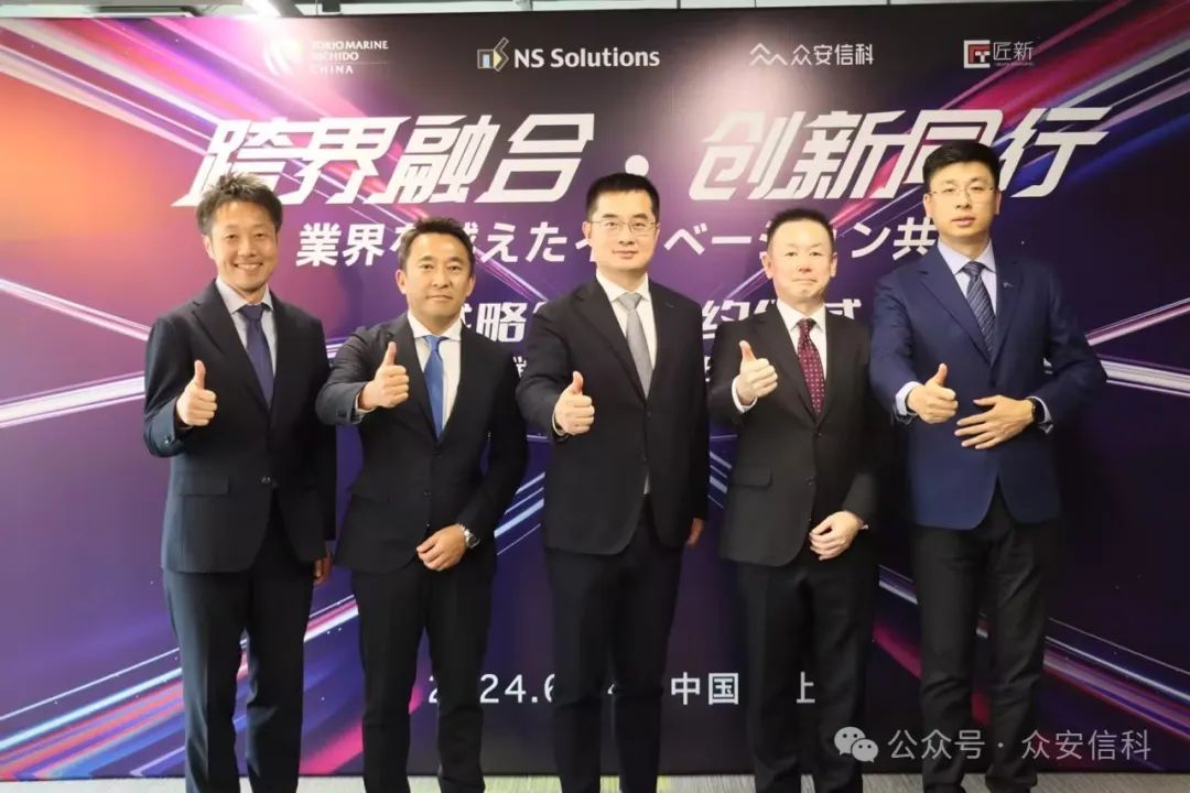 东京海上日动(中国)董事兼总经理结城一郎,日铁软件中国董事总经理久保良一,匠新创始人CEO兼董事长田中年一,众安保险常务副总经理兼董事会秘书、众安信科董事长王敏及众安信科CEO郁锋出席活动并签署协议。
