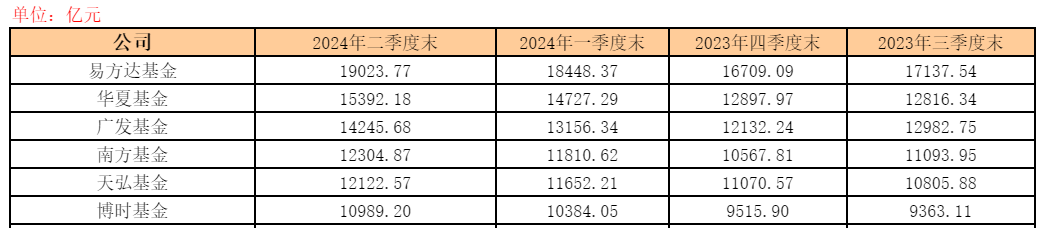 截至二季度末,有6家基金公司规模超过万亿元,分别是易方达基金、华夏基金、广发基金、南方基金、天弘基金、博时基金。其中,易方达基金规模为19023.77亿元,排名第一;华夏基金凭借15392.18亿元规模排名第二。