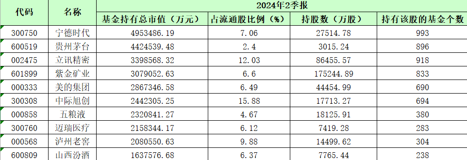 除了宁德时代,截至二季度末,公募基金前十大重仓股还包括贵州茅台、立讯精密、紫金矿业、美的集团、中际旭创、五粮液、迈瑞医疗、泸州老窖和山西汾酒。