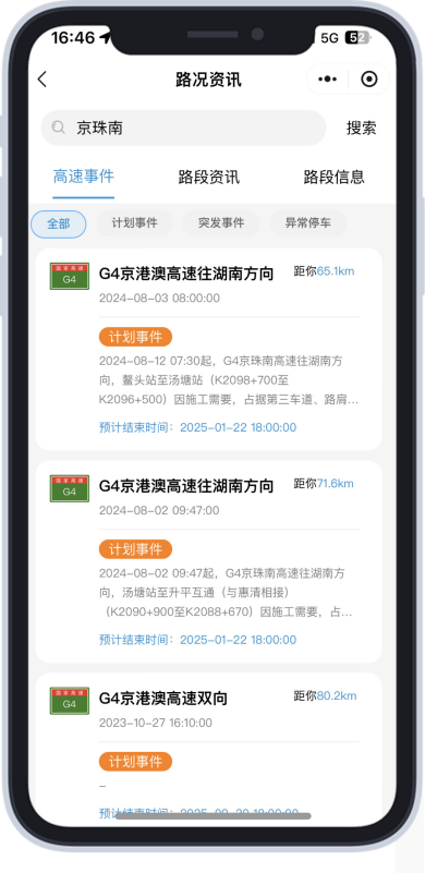 通过“路况资讯”功能,用户可直观、实时查看高速路段的通畅情况,了解更全面的路况信息,包括道路拥堵、突发事件、道路施工、路段资讯以及异常停车预警等信息,以便提前规划行程以及错峰出行,让出行更加高效、省心。