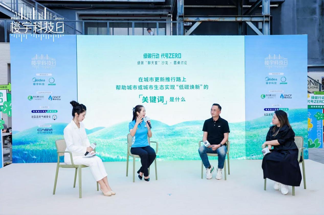 美的楼宇科技事业部解决方案与交付总监杨鹏宇、阿拉善SEE珠江项目中心工委副主席张亚娟、阿拉善SEE珠江项目中心区域代表兼项目总监陈思远、气候行动公益组织主理人代表谢若琪、以及重要合作伙伴安踏品牌代表一起围绕城市更新、绿色实践、“0碳”未来展开圆桌讨论,分享各自在探索低碳发展路上的前沿趋势与实践路径,描绘城市生态的绿色焕新未来。