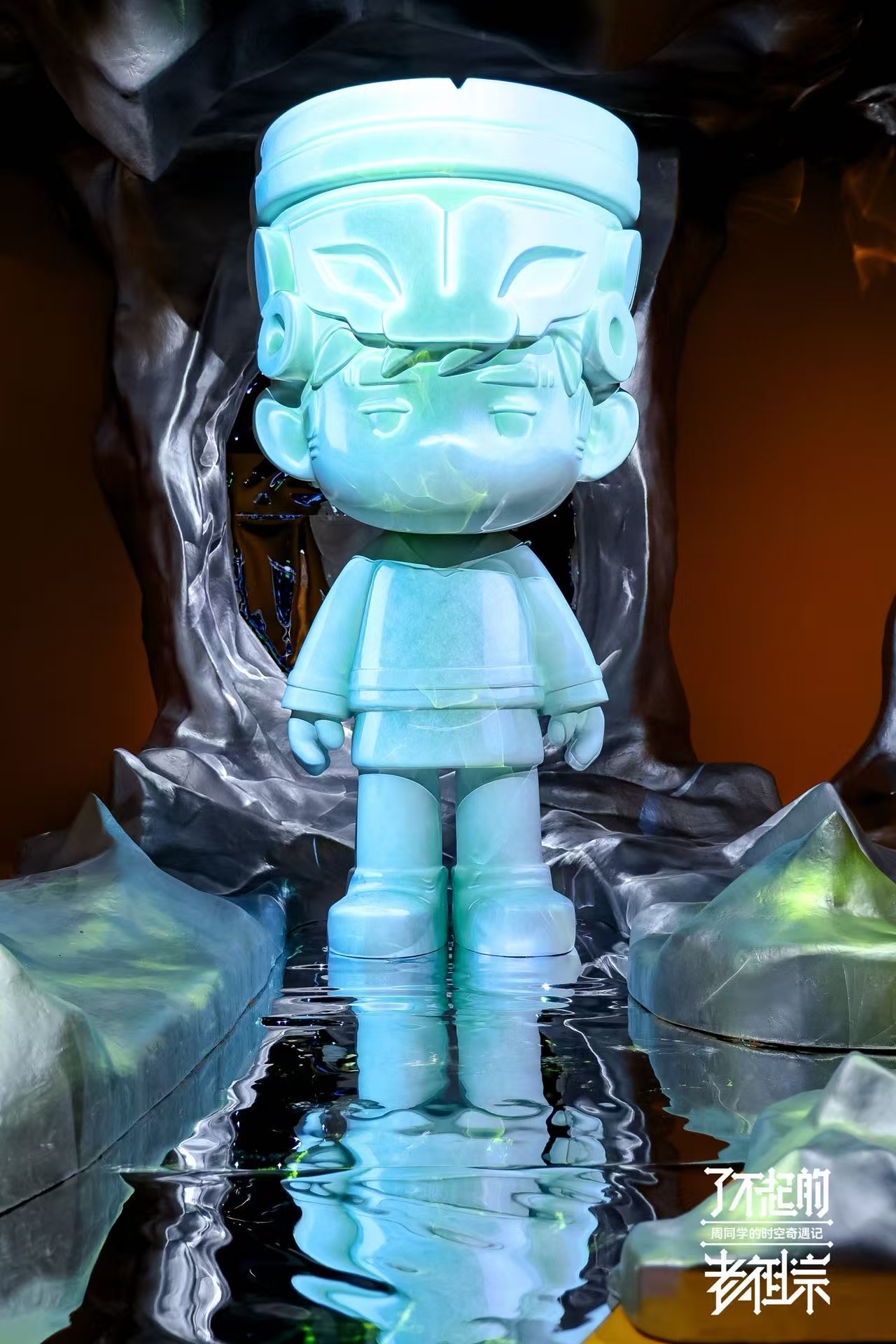 本次艺术秀并非将文物和IP简单罗列,而是真正让它们实现“对话”。比如将四千多年前的“玉神人”,通过潮流转译,变成一个戴着未来感冠帽的“周同学”巨像投影,在“玉见未来”的未来考古概念展区展现中国玉石之美。