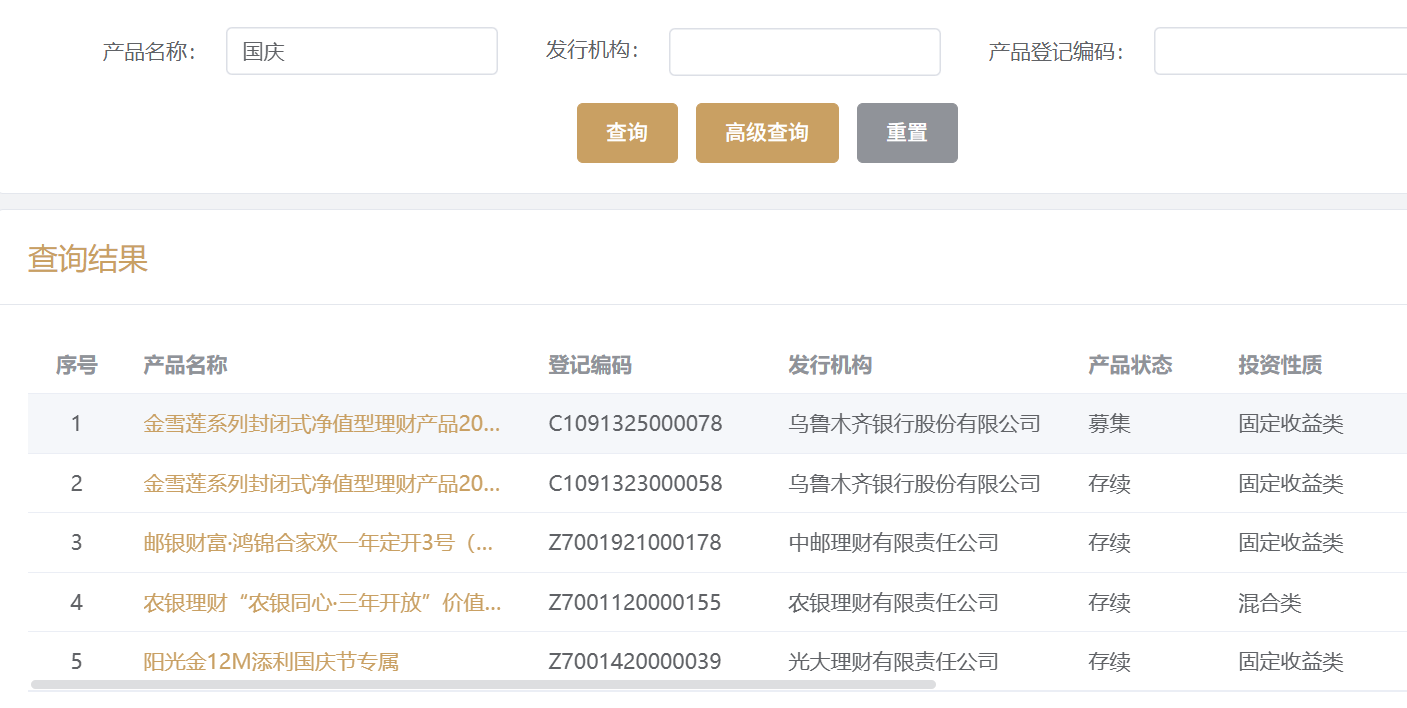 从理财产品名称来看,与往年新发带有“国庆专属”理财产品的情况不同。时代周报记者以“国庆”为关键词在中国理财网搜索发现,截至目前,国庆节专属理财产品共计5只,其中4只存续,1只募集,且多为中短期、固收类产品,业绩比较基准上限最高达到5.4%,为农银理财发布的“农银同心·三年开放”价值精选(欢度国庆)。