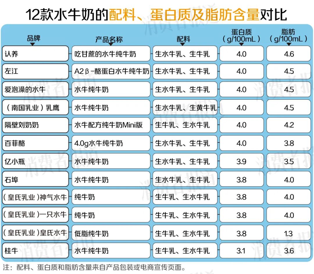 然而,市面上所谓的“水牛奶”,几乎都不是货真价实的100%水牛奶源。《消费者报道》对比了市面上12款水牛奶,无一仅使用生水牛乳,其中11款包含生牛乳(也就是常见纯牛奶的原料),1款包含生黄牛乳。
