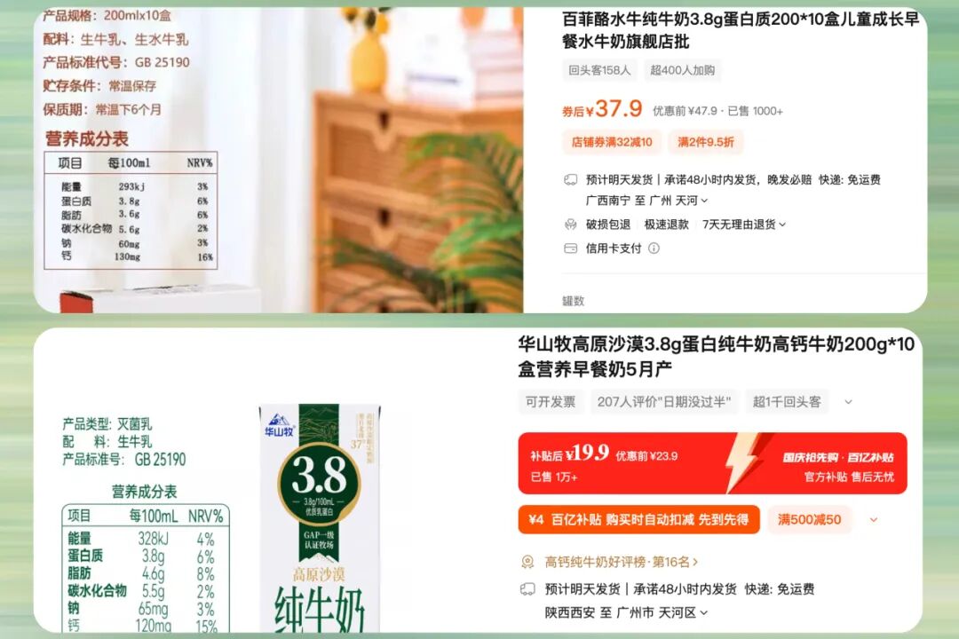“物以稀为贵”在水牛奶上体现得淋漓尽致。以某款水牛奶和某款纯牛奶为例,在规格一致、蛋白质均为3.8g/100mL的情况下,水牛奶每箱(10盒装)的价格为37.9元,而纯牛奶则为19.9元,价差近2倍。