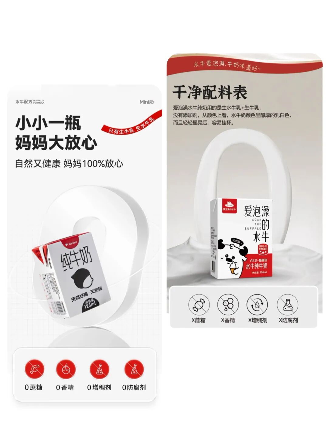 此外,不少商家打着“天然甜”“无奶腥”“让小朋友更爱喝奶”等卖点,将水牛奶包装成更适合儿童饮用的牛奶。为了突出产品的“纯净”,有些商家强调其“0添加”蔗糖、香精、增稠剂、防腐剂等各种食品添加剂,但实际上,相关产品执行的国家标准GB 25190本来就禁止添加这些成分。