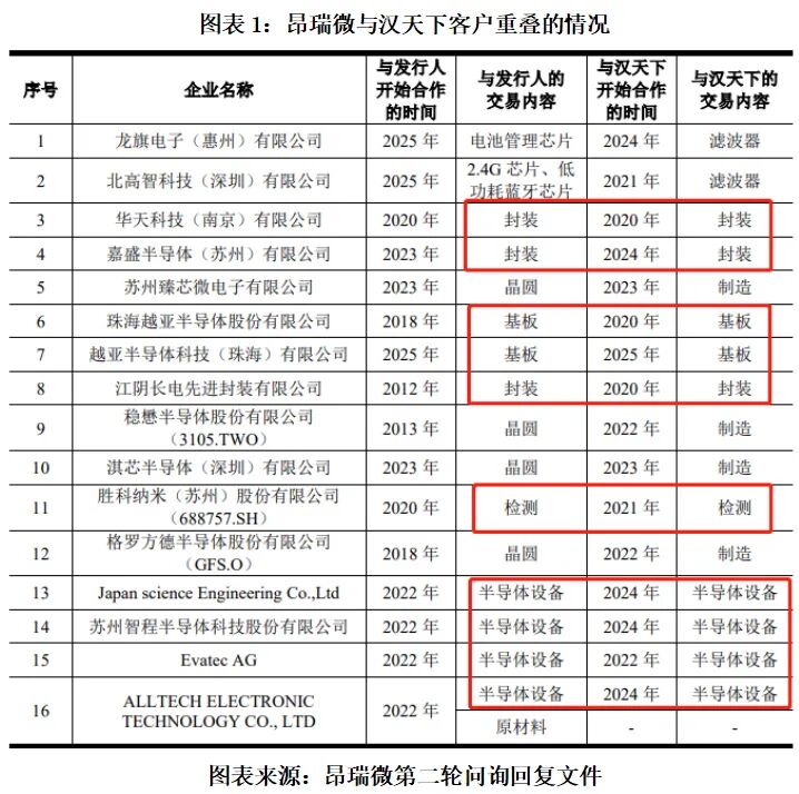 第二轮问询回复文件显示,昂瑞微与汉天下重叠的客户共计16家,其中,华天科技(南京)有限公司、嘉盛半导体(苏州)有限公司等多家客户向昂瑞微与汉天下采购同一类型的产品。