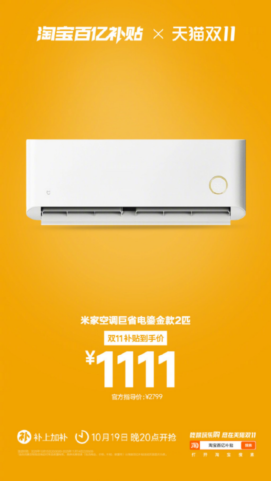 米家空调巨省电鎏金款2匹“双十一”价1111元 图源:淘宝