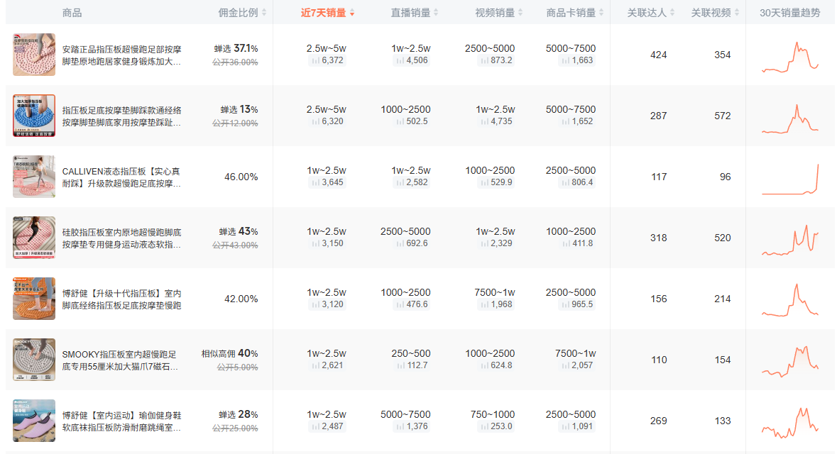 某直播电商平台上,不同尺寸的指压板价格不同,售价大概在几元到上百元不等,销量从数百件到数十万件不等。据第三方数据公司的数据,截至2025年10月20日,近30天,该直播平台上的众多品牌指压板销量迅速飙升,关联达人及关联视频均在三位数以上。