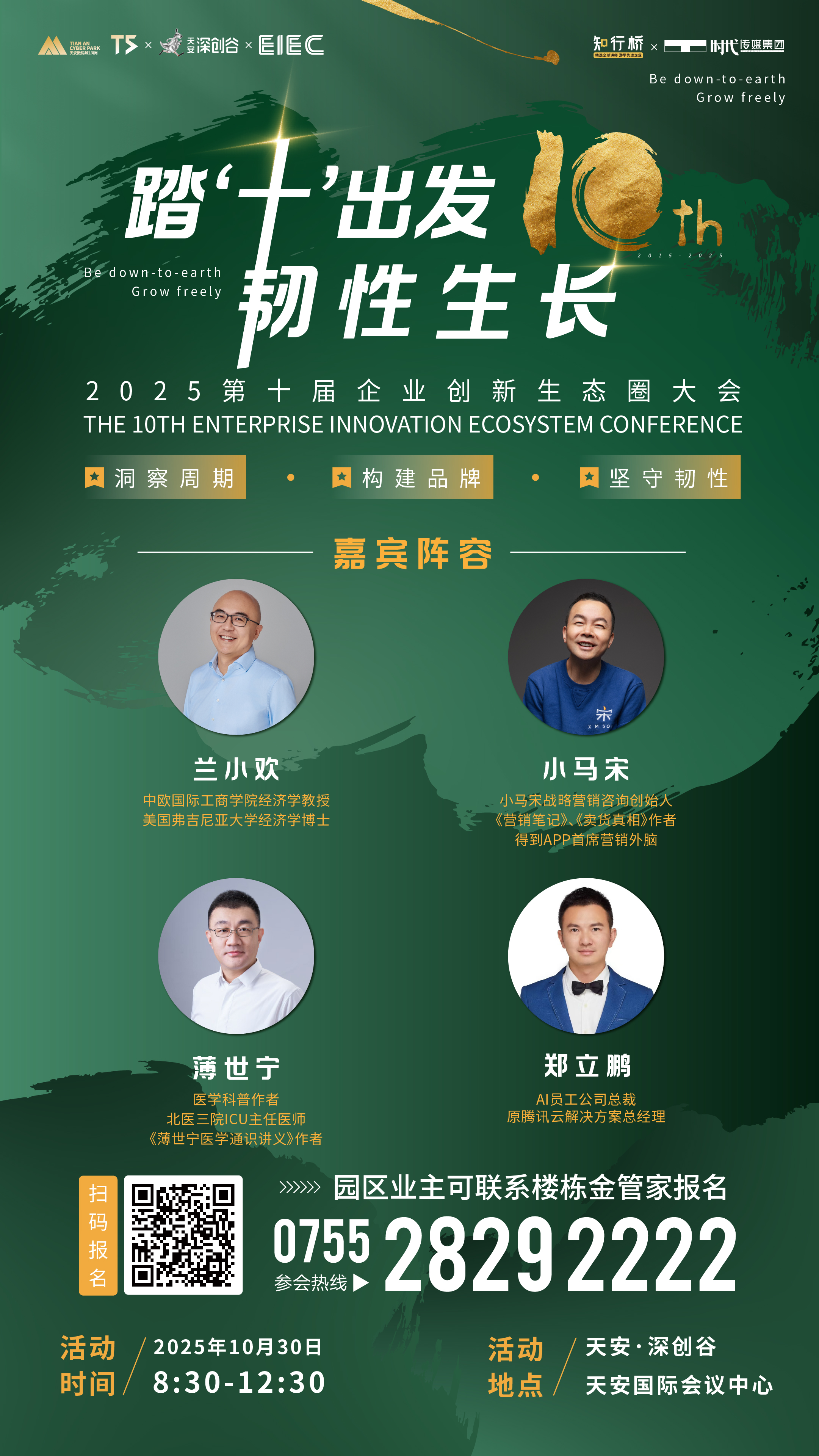 天安数码城第十届企业创新生态圈大会将于10月30日在凤岗天安·深创谷国际会议中心启幕,来自经济、科技、品牌、健康等领域的专家学者与企业家齐聚,聚焦“踏‘十’出发·韧性生长”主题,共探企业在新周期下的可持续路径。