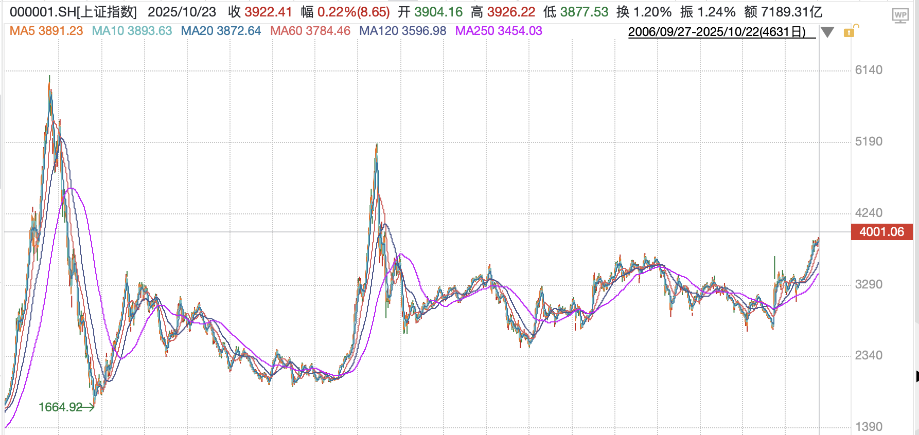 这是沪指自2015年8月之后,时隔十年盘中突破4000点。