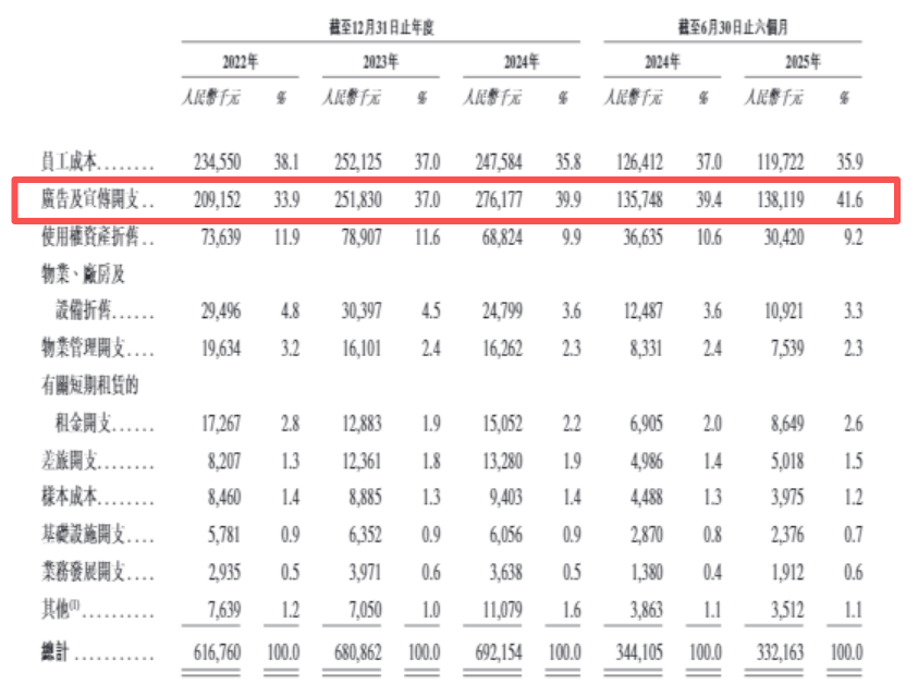 其中,仅广告及宣传开支一项就分别支出了2.09亿元、2.52亿元、2.76亿元、1.38亿,过去三年半时间共累计支出约8.75亿元。与此同时,公司对广告宣传这依赖度也在不断提升,广告及宣传开支在销售及营销开支中的占比从2022年的33.9%一路提升至2025年上半年的41.6%。