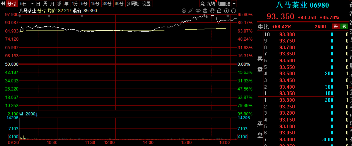 10月28日上午九时,八马茶业(06980.HK)正式在港交所开始买卖,股价开盘便一度上涨超60%,截至收盘时,股价为93.35港元/股,涨幅达到86.70%。