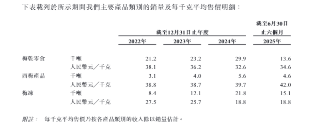 收入增长一定程度上得益于溜溜果园过去几年间“以价换量”的打法。2022年-2024年,公司两大主要产品的售价出现明显下降,梅干零食由38.1元/千克降至32.6元/千克,梅冻则由27.5元/千克降至18.8元/千克。
