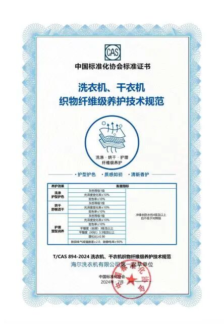 例如,海尔先后推出T/CAS 359-2019《空气洗设备护理功能评价规范》和T/CAS 894-2024《洗衣机、干衣机织物纤维级养护技术规范》,明确了无水烘干、有水空气洗、蒸汽空气洗等定义,制定了多维度的硬性指标,如蒸汽空气洗的除菌性能不小于98%、除螨性能不小于99%等。