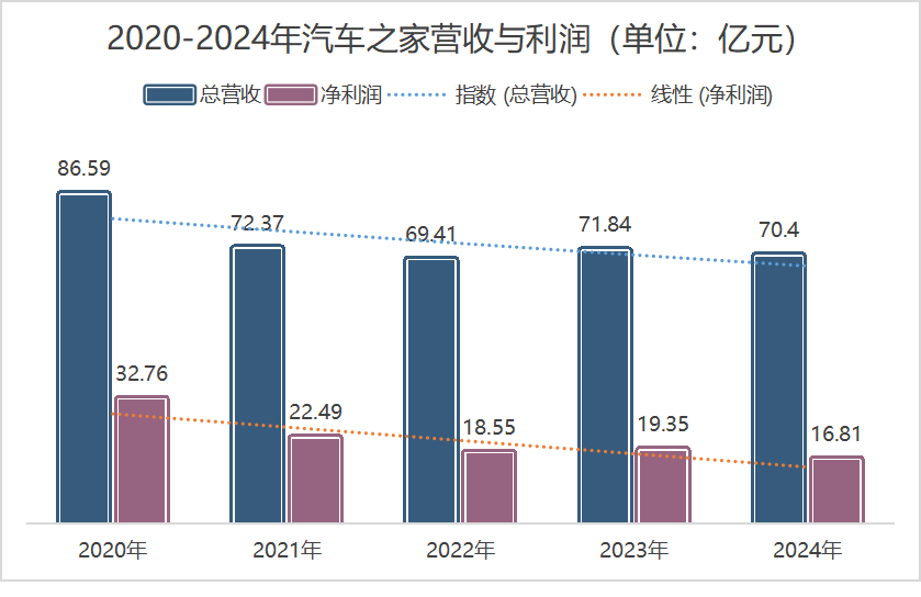 2024年,汽车之家的收入降至70.4亿元,净利润也缩减至16.81亿元。