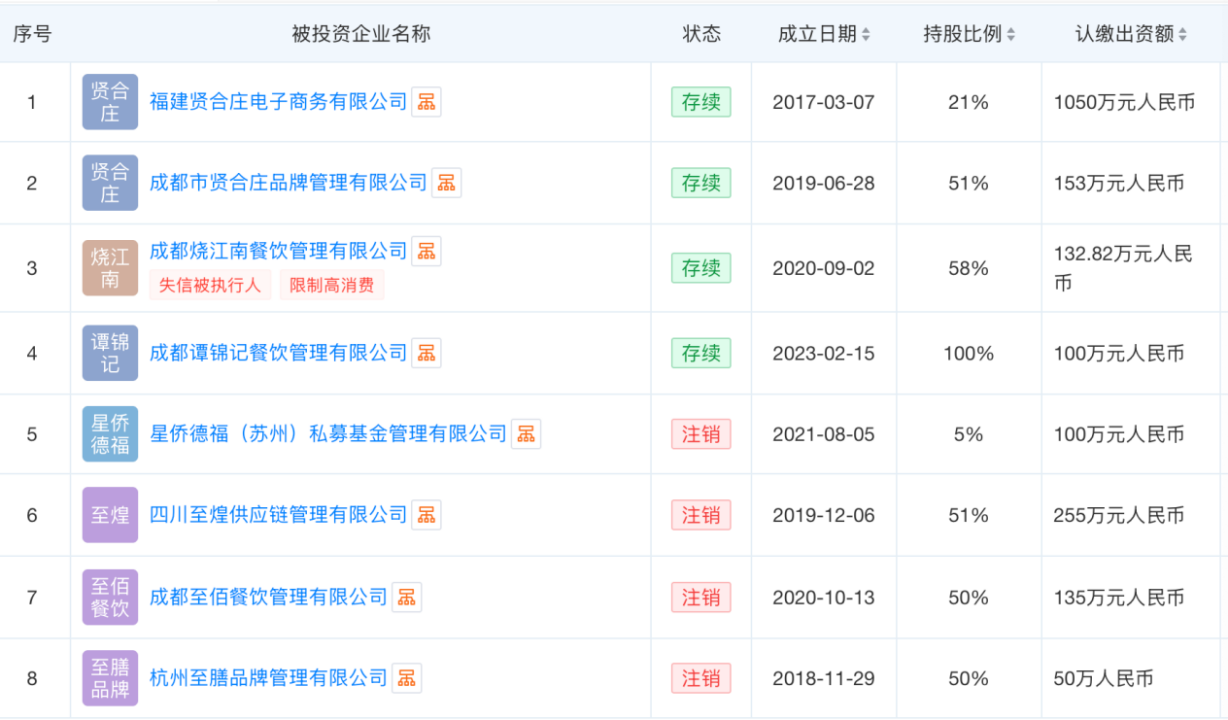 值得注意的是,不少此前火热的明星餐饮公司背后的“操盘者”都是四川至膳品牌管理有限公司,包括贤合庄、烧江南、卤味烧烤店灶门坎、天然呆奶茶等。据天眼查,该公司成立于2017年,“谭鸭血”老火锅也在该公司旗下。