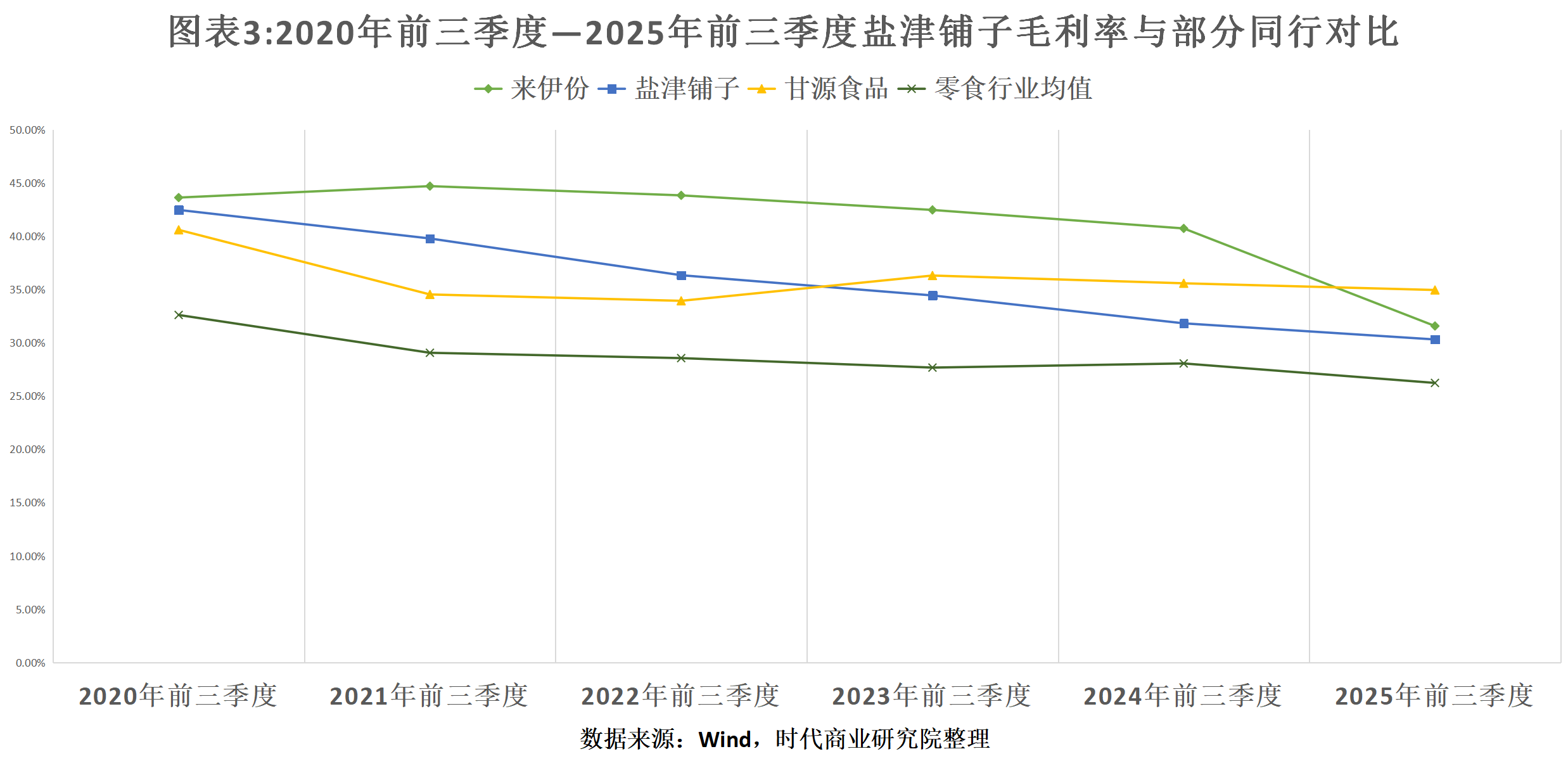 Wind数据显示,2020年前三季度—2025年前三季度,盐津铺子所属零食行业(申万三级)的毛利率从32.62%降至26.24%,持续低于盐津铺子,但差距不断收窄。从单个企业来看,2020年前三季度—2022年前三季度,盐津铺子的毛利率仅略低于来伊份(603777.SH),位列行业第二。但是2023年前三季度—2025年前三季度,其毛利率被甘源食品(002991.SZ)反超,毛利率降至行业第三。