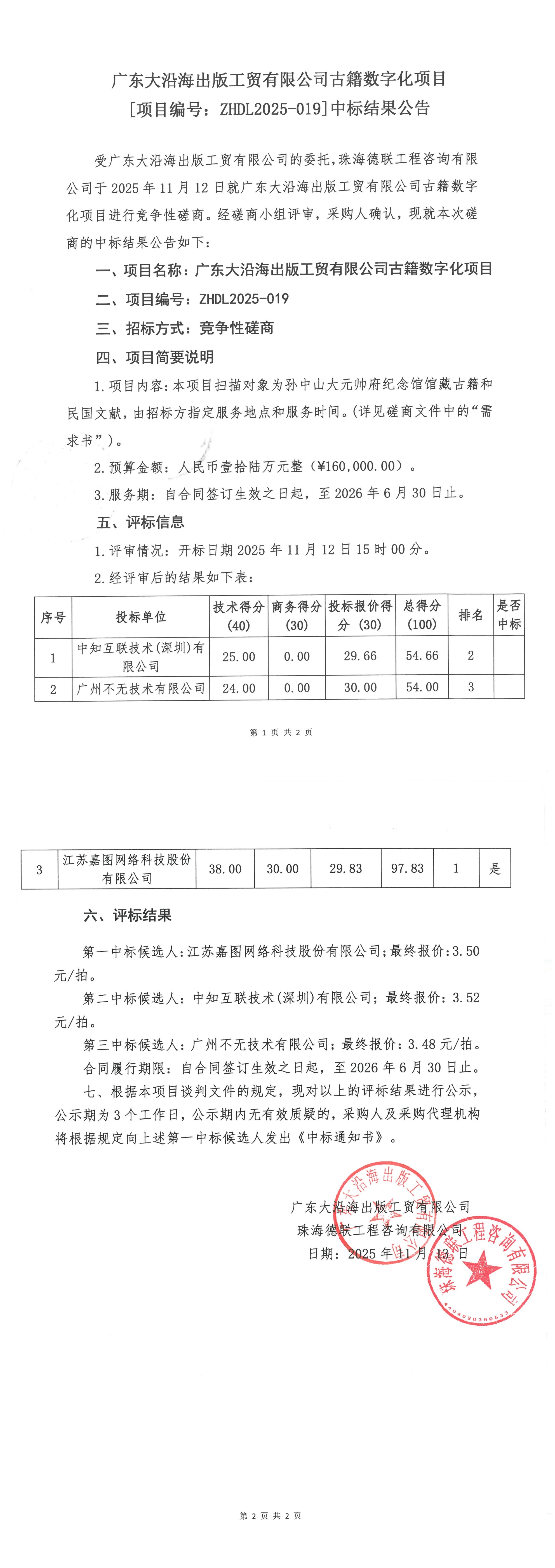 广东大沿海出版工贸有限公司古籍数字化项目[项目编号:ZHDL2025-019]中标结果公告