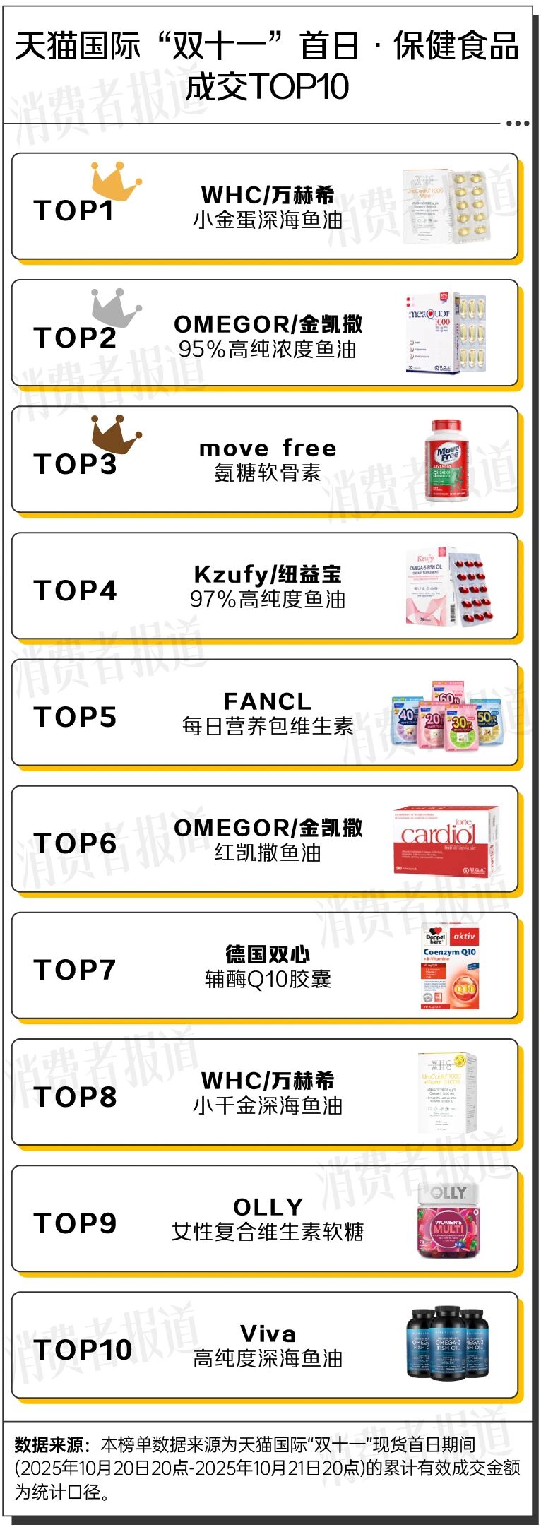 天猫国际发布的今年“双十一”现货首日(10月20日20点—10月21日20点)成交榜数据显示,营养健康赛道成交金额排名前十商品分别为WHC/万赫希小金蛋深海鱼油、OMEGOR/金凯撒深海鱼油、Move Free/益节氨糖软骨素、Kzufy小粉钻鱼油、FANCL每日营养包维生素、OMEGOR/金凯撒红凯撒鱼油、德国双心辅酶Q10胶囊、WHC/万赫希小千金深海鱼油、OLLY女性复合维生素软糖、Viva高纯度深海鱼油。由此可见,保健品功效赛道呈现新旧交织的发展态势:血脂、抗衰、关节等成熟赛道表现稳健,鱼油、辅酶Q10和氨糖软骨素等产品深受用户青睐。