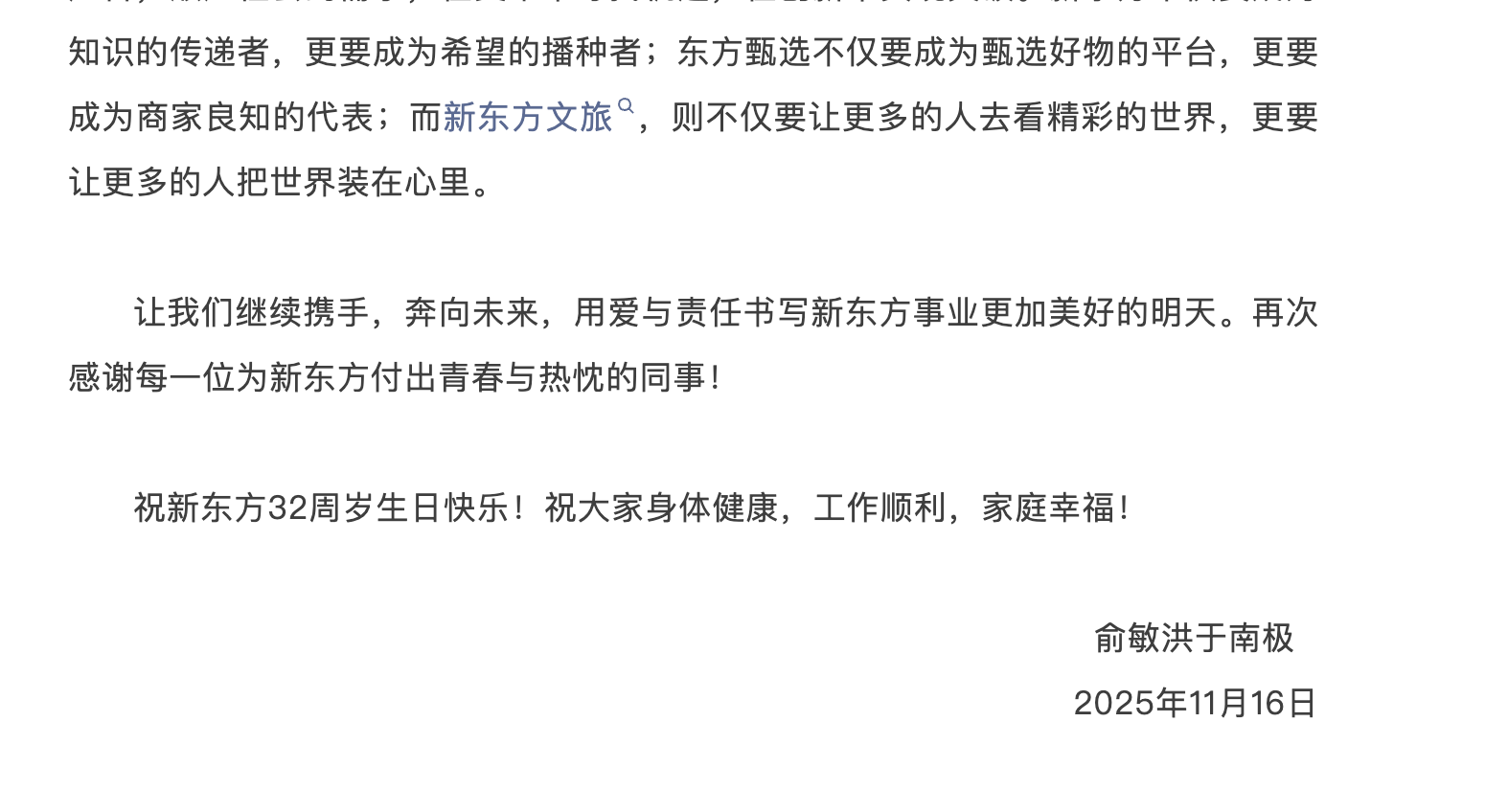 11月16日,新东方创立32周年,俞敏洪发布了一封全员信,回顾了新东方32年的创业路,并向全体新东方员工及参与过新东方事业的同行人致谢。