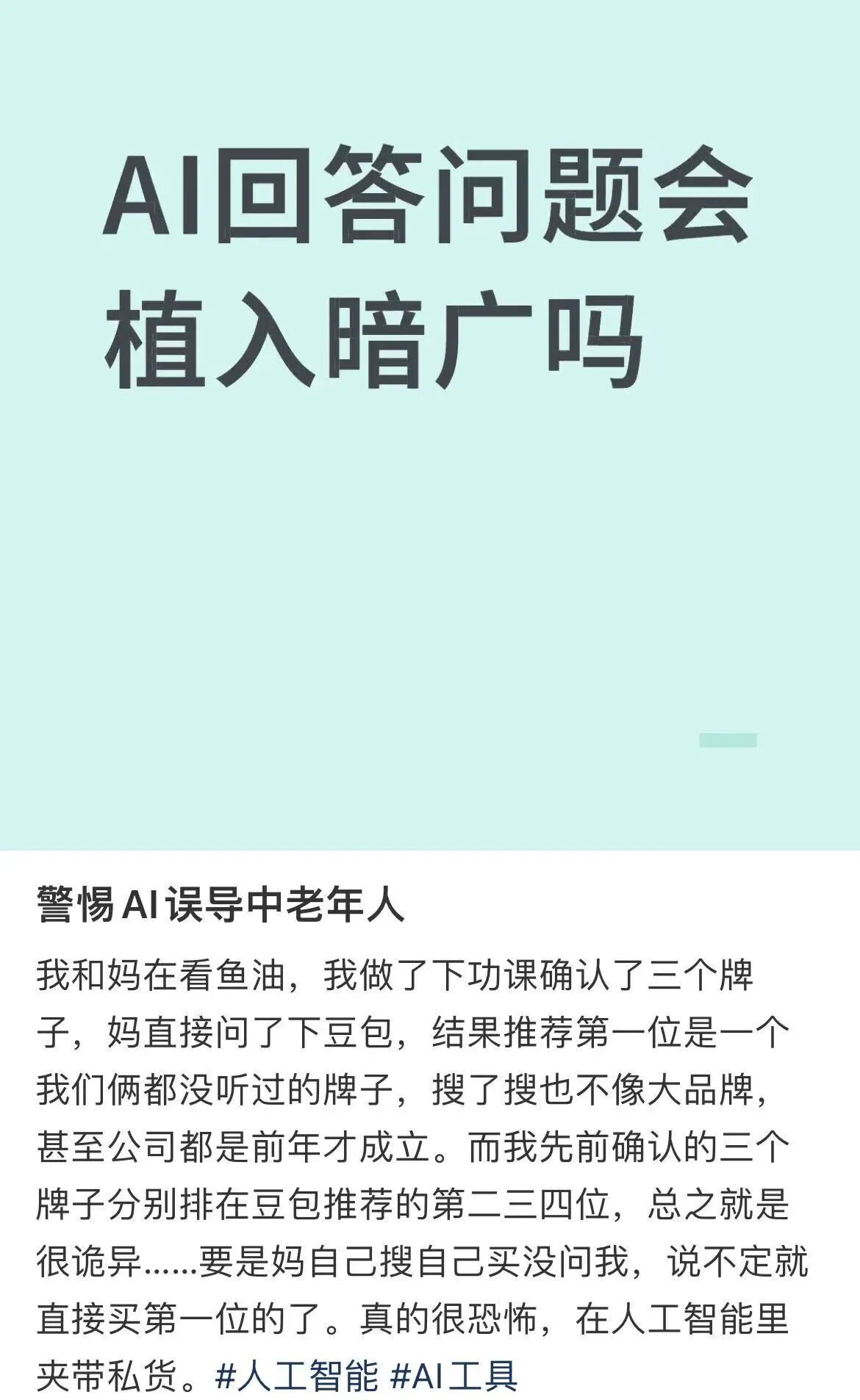 由此可见,AI在回答“产品推荐”“品牌推荐”问题时并非绝对客观中立。眼下,已经有不少用户察觉到“AI被植入广告”的端倪。社交平台上,有用户称AI推荐的鱼油品牌中,居首的竟是一个成立仅两年的小众品牌,因此质疑AI问答被植入广告,可能对中老年消费者造成误导。