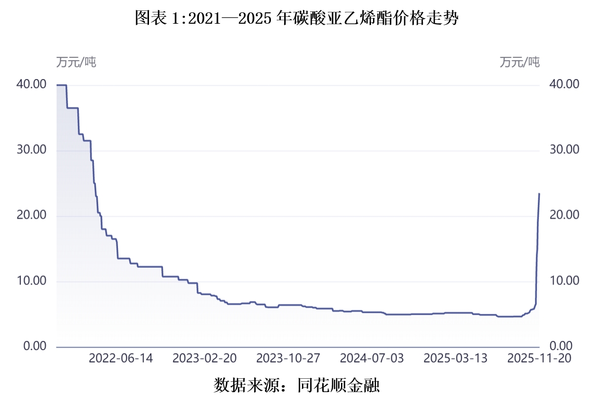 目前,电解液添加剂VC(碳酸亚乙烯酯)仍是维持一天一个价的上涨态势,从11月初的6万元/吨已飙升至11月20日的23.5万元/吨。同期VC龙头华盛锂电(688353.SH)股价在短期飙涨近200%,随后又大幅回调,VC涨价的可持续性似乎受到市场质疑。