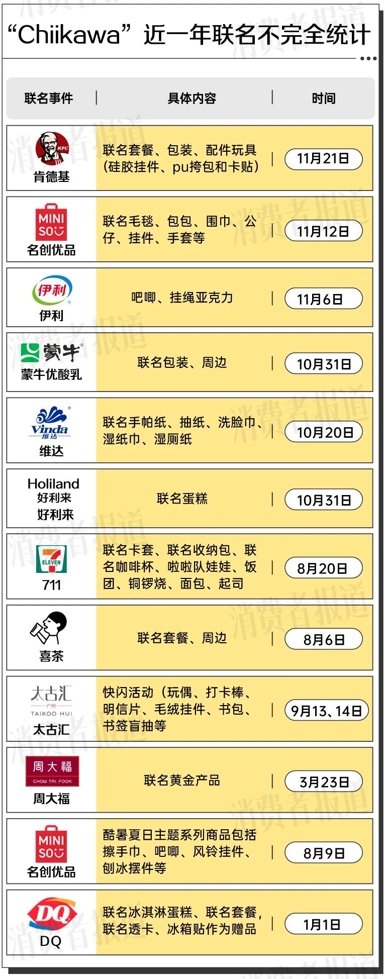 联名狂潮开始兴起,据记者不完全统计,今年以来,Chiikawa与包括肯德基在内至少联名11次。