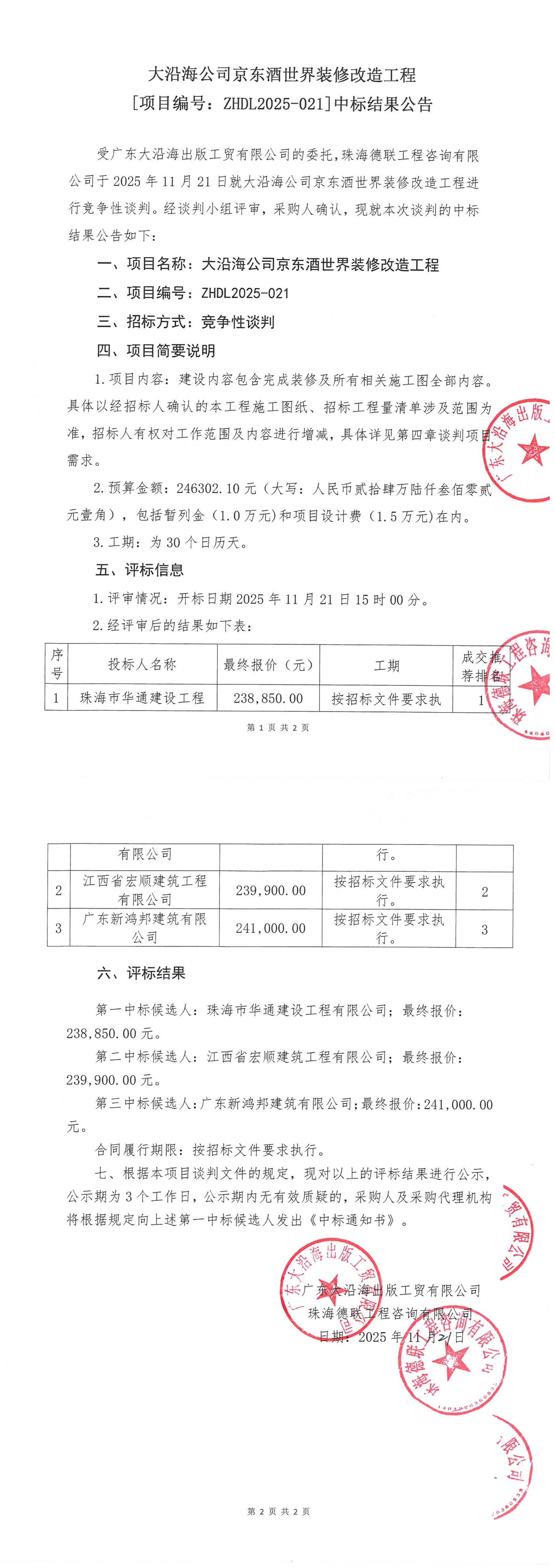 大沿海公司京东酒世界装修改造工程[项目编号:ZHDL2025-021]中标结果公告