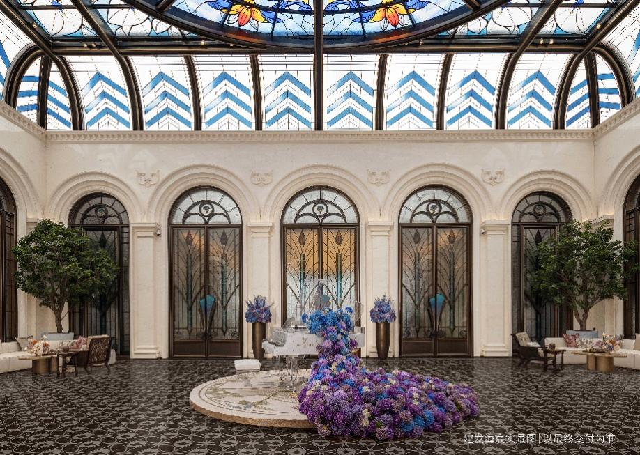 更令人瞩目的是近期开放的实景展示区:从玉兰花造型的巨型门头,到挑高9米的迎归大堂,再到莳花荟中央会客厅,随处可见彩绘玻璃穹顶、艺术拱门与浮雕墙面等海派元素。细节处更融入珐琅、苏绣、珠绣、大漆等非遗工艺,生动诠释了建发·海宸独特的“海派东方”风格美学——融汇万国风情与华夏文化瑰宝,博采全球经典,中魂西骨,绚烂华丽。