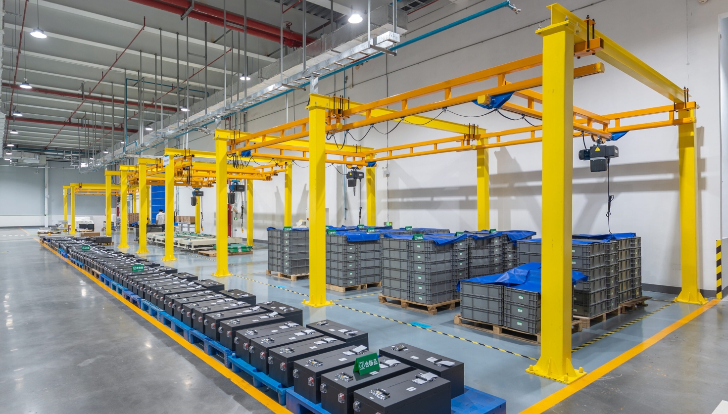 这个按照国家丙类仓库标准建设的仓库,配备了全域红外热成像监控系统,每个库位的电池包和模组也放置了温控传感器探测电池温度的变化,一旦温度超过45°C,监控系统会发出警报,并由值班人员第一时间进行检查和处置。库位则用防火板进行隔离,同时配置喷淋装置、消火栓、灭火器、消防水池等。