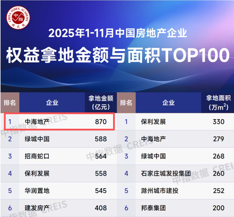 11月28日,中指研究院发布《2025年1-11月全国房地产企业拿地TOP100排行榜》。根据该榜单,今年前11月,中海地产以高达870亿元的权益拿地金额,位列行业第一。绿城中国位居第二,权益拿地金额为588亿元,两者相差超280亿元。